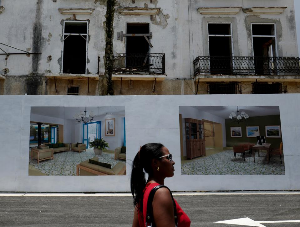 A pedestrian passes in front of renderings displayed on a hotel under construction in Havana, Cuba, on Friday, June 16, 2017. Photographer: Eliana Aponte/Bloomberg