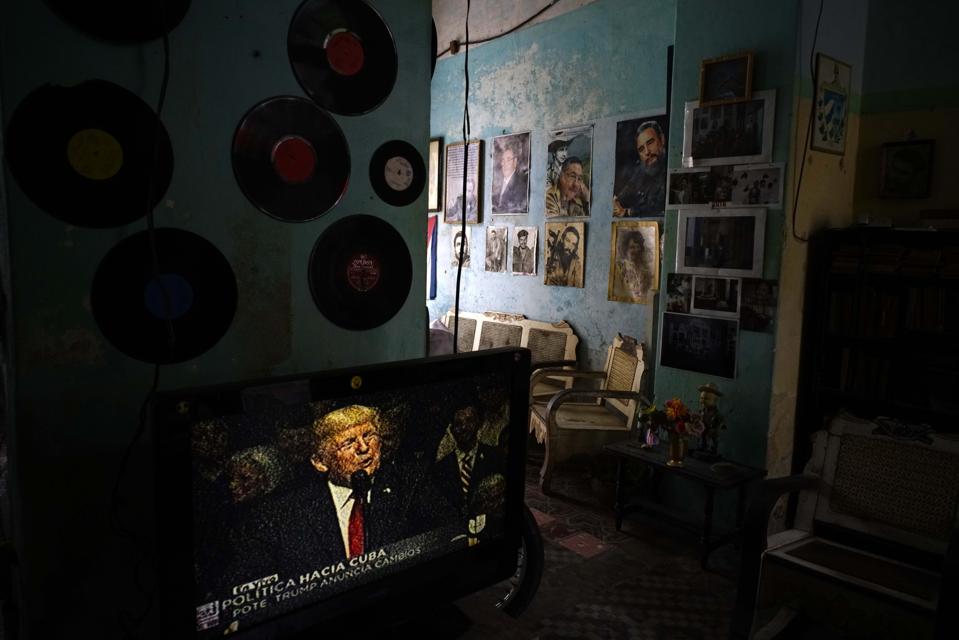 A television set in a house in Havana shows U.S. President Donald Trump announcing his new Cuba policy. (AP Photo/Ramon Espinosa)