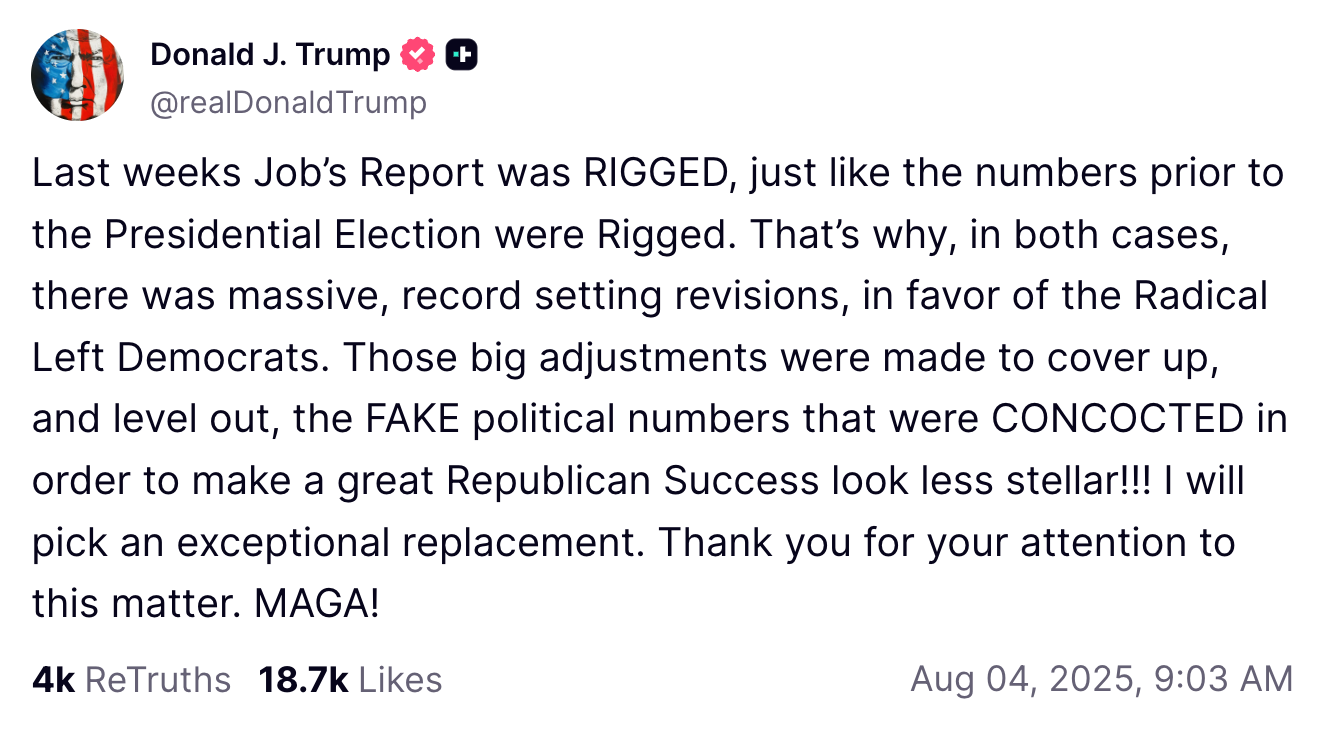 Pero eso es lo que están haciendo. En tan solo unas horas, el economista jefe de Trump respaldó sus teorías conspirativas y declaró la intención del gobierno de reemplazar al personal de la Oficina de Estadísticas Laborales (BLS) con leales políticos. En CNBC, Kevin Hassett , director del Consejo Económico Nacional, declaró que