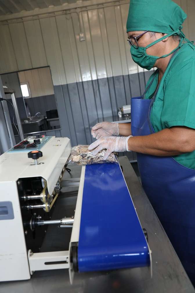 En estos momentos en el área de procesamiento cuentan con una línea de producción compuesta por una empaquetadora selladora continua y una selladora al vacío. El resto del proceso es manual, explicó Vicente Tabares López, jefe de almacén. Todos los trabajadores poseen los medios de protección: guantes anticorte, delantales de lona, pijamas, nasobucos y botas, de igual manera conocen todas las normas de higiene personal a cumplir y todo el proceso es monitoreado a través de un circuito de cámaras”, agrega Gabriela.