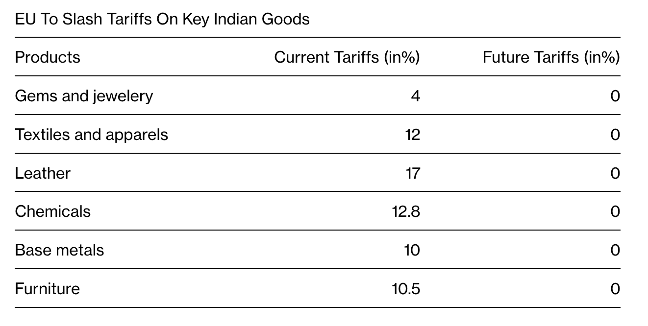 Y ambas economías se complementan. Europa se enfrentará a aranceles mucho más bajos para sus exportaciones a la India de bienes que abarcan desde automóviles hasta aceite de oliva. India obtendrá acceso al mercado europeo para sus exportaciones de productos con uso intensivo de mano de obra.